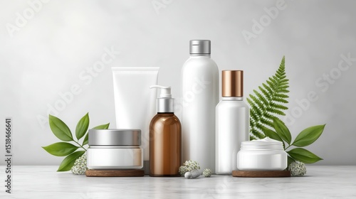 Elegant collection of skincare products including bottles jars and containers arranged with green leaves and fern on a light grey background emphasizing beauty and wellness