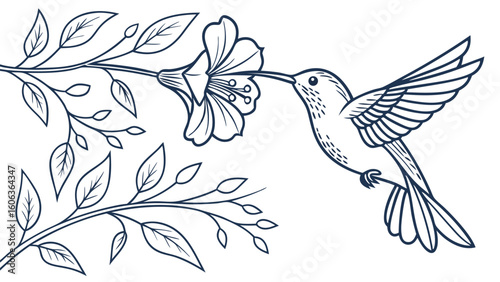 Elegant contour hummingbird feeding on a flower vector illustration with delicate leaves and branches design available on white background
