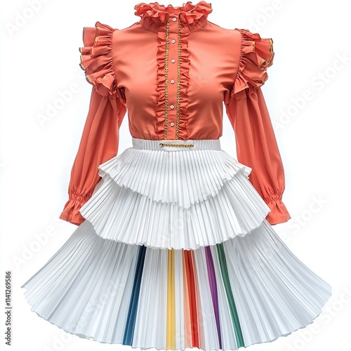 outfit, designer, blouse, skirt, coral, orange, white, pleated, rainbow, ensemble, fashion, clothing, style, design, apparel, garment, woman, woman, lady, female, attire, dress, textile, fabric, pleated, frill, layered, collar, buttons, gold, chain, detail, stylish, chic, trendy, modern, contemporary, sophisticated, elegant, pretty, beautiful, summer, spring