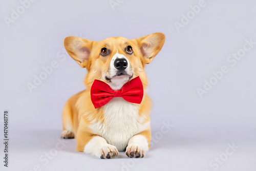 Elegant Corgi in a Red Bow Tie: Sophisticated Pet Portrait on a Neutral Background