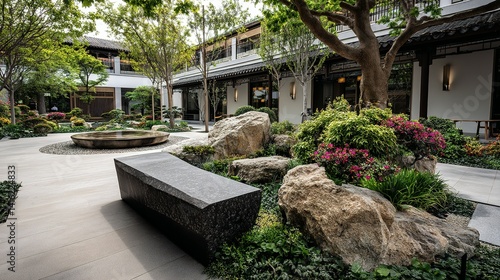 courtyard, garden, landscaping, aesthetic, serene, zen, tranquil, space, design, stone, rock, boulder, plant, shrub, bush, flower, foliage, fountain, paved, paseo, path, bench, furniture, modern, architecture, structure, building, detail, japanese, chinese, inspiration, harmony, nature, peace, beauty, exterior, calm, relaxation, meditation, lighting, grey, brown, green, texture