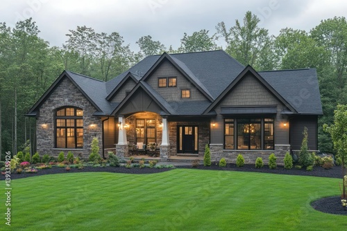 house, home, modern, craftsman, luxury, estate, new, construction, exterior, design, architecture, suburb, property, residential, wood, stone, dark, grey, black, roof, window, front, lawn, yard, garden, landscaping, tree, forest, evening, light, patio, porch, pillar, driveway, investment, renovation, building