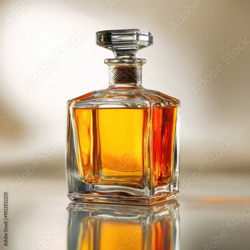 Elegant crystal decanter filled with golden liquor on reflective surface capturing the essence of refined taste