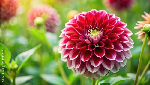 Elegant dahlia flower amidst lush green foliage, showcasing vibrant ruby and ivory blossoms in harmony with nature, dahlia