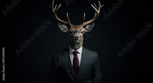 cervid, business, suit, nature, modernity, animal, concept, surreal, antler, elegance, wildlife, contrast, creativity, fusion, dark, formal, attire, unique, professional, symbolic, expression, art, mysterious, sophisticated, hybrid, creature, portrait, idea, fantasy, imagination, dark background, isolated, combination, standing, pose, visual, metaphor, style, contemporary, harmony, balance, power, strength, confident, individuality, juxtaposition