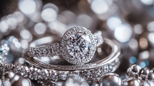 Elegant diamond ring surrounded by shimmering jewelry, showcasing luxury and beauty in a stunning close-up.