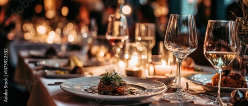 Elegant Dining Table Setting with Gourmet Food and Wine Glasses in Candlelight Restaurant Ambience Close Up View
