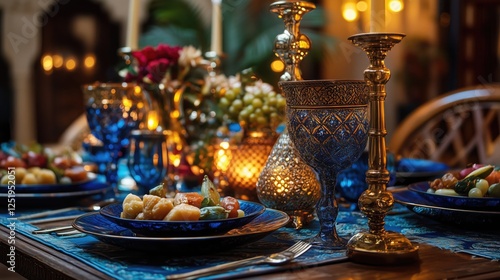 arabic, dinner, setting, crockery, candlelit, ambience, elegant, table, candle, blue, gold, plate, ornate, utensil, luxurious, goggles, centrepiece, grape, romantic, warm, light, dining, food, vegetable, evening, occasion, stylish, arrangement, decorative, home, interior, cosy, inviting, gold, reflective, artistic, meal, celebration, hospitality, design, mood, festive, atmosphere, tableware, epicure