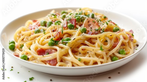 Elegant dish of creamy carbonara pasta, featuring crispy pancetta and a delicate egg sauce, garnished with fresh green peas, isolated on white