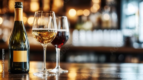 Elegant display of a sparkling wine bottle and wine glasses in a cozy bar setting : Generative AI
