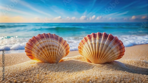 Elegant dual-tone scallop shells on a sandy beach , marine, chic, shells, scallop, dual-tone, elegant, beach, sand, ocean