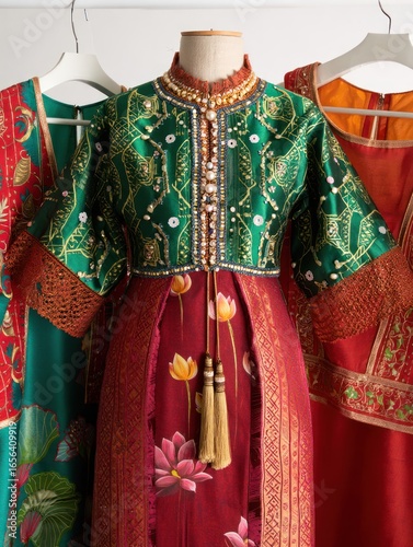 garment, embroidery, fashion, clothing, textile, fabric, design, elegant, ornate, intricate, beadwork, pearl, luxury, traditional, cultural, art, floral, lotus, pattern, style, rich, craftsmanship, sewing, detail, embellishment, silk, ethnic, oriental, aesthetic, beauty, feminine, sophisticated, apparel