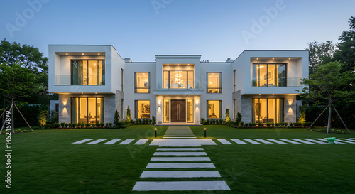 house, exterior, modern, home, architecture, building, residential, lawn, real, estate, luxury, design, contemporary, property, facades, lifestyle, illuminated, manicured, yard, pathway, nobody, twilight, construction, investment, suburban, wealth, affluent, residence, family, outdoors, landscaping, calmness, serene, expansive, roomy, pristine, geometric, symmetric, welcoming, inviting, flourishing, upscale
