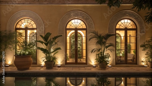 Elegant Facade with Illuminated Arches, Potted Plants, and Reflective Pool