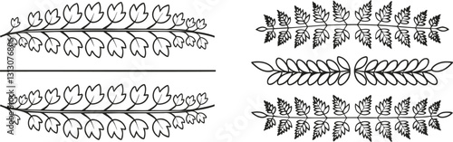 Elegant Fern Fronds and Eucalyptus Branches Alternating Stripes Line Art Vector Design