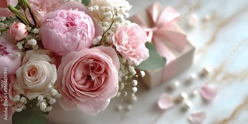 elegant, flat, lay, pale, pink, rose, peony, breath, pearl, white, marble, gold, veining, small, gift, box, floral, arrangement, luxurious, beautiful, delicate, soft, gentle, wedding, romance, beauty, nature, stone, rock, precious, jewellery, present, wrapping, ribbon, bow, smooth, hard, cold, surface, texture, shiny, art, composition, aesthetic, clean, minimal, romantic