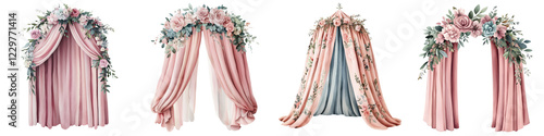 floral, decor, wedding, event, arch, curtain, curtain, pink, flower, rose, bouquet, design, elegant, romantic, luxurious, fabric, drape, garland, foliage, leaf, greenery, nature, botanical, stage, altar, ceremony, venue, indoor, fairy, dream, beauty, soft, luxury, bridal, aesthetic, chic, stylish