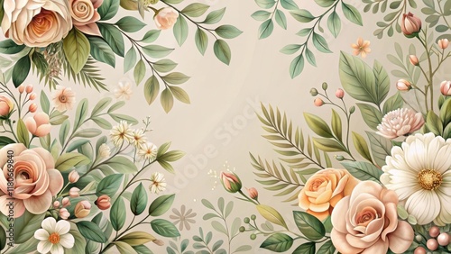 rose, flower, floral, greenery, leaf, botanical, blossom, bloom, flower petals, bud, delicate, elegant, romantic, wedding, invitation, design, artwork, illustration, pastel, beige, background, nature