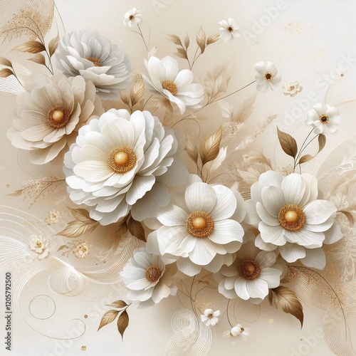Elegant Floral Arrangement Featuring White and Gold Flowers with Artistic Leaves and Stems in a Soft, Neutral Background Illustrating the Harmony and Tranquility of Nature's Beauty and Serenity