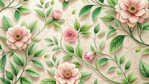 Elegant Floral Design Featuring Delicate Pink Blooms and Lush Green Foliage on a Soft Beige Background