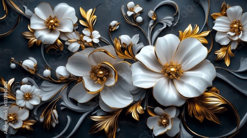 Elegant Floral Design: White Flowers with Gold Accents in Symmetrical Pattern on Dark Grey Background