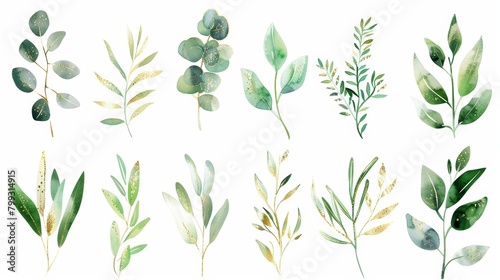 watercolor, floral, illustration, wedding, stationery, greeting, wallpaper, green, gold, leaf, tree branch, collection, design, pattern, decorative, botanical