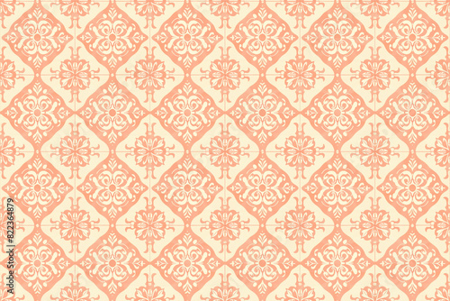 Elegant floral tile pattern with intricate peach designs on a beige background, creating a sophisticated and seamless design for decoration. Ideal for textiles and backgrounds.