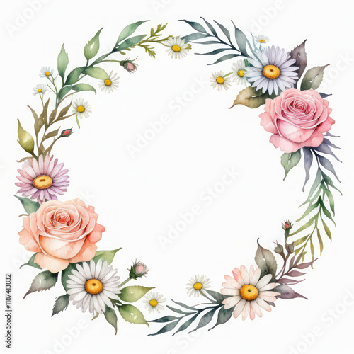 Elegant floral wreath featuring roses and daisies with greenery for creative design