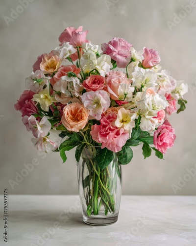Elegant flower bouquet in a glass vase on a white table, symbolizing beauty and celebration.