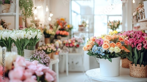 Elegant Flower Shop Interior Display with Colorful Blooms, Vases, and Soft Sunlight Illuminating Detailed Textures in Warm Tones