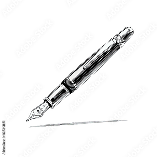 fountain pen, pen, ink, writing, illustration, drawing, elegant, luxury, stationery, office supply, nib, calligraphy, script, signature, contract, agreements, document, business, professional, classic, vintage, retro, style, design, art, graphic, black-and-white, monochrome, silver, metal, author, writer, journalist, diary, sketchbook, creative