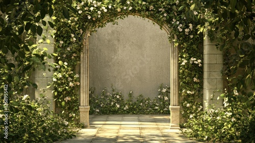 Elegant garden archway, sunlit patio, flowers, peaceful scene