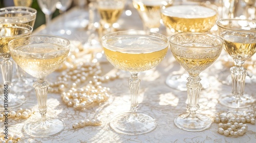 Elegant Gatsby-style bar table with gold accents, champagne glasses, and pearls.