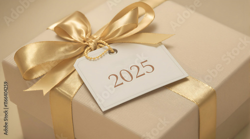 Elegant Gift Box with Golden Ribbon and 2025 Tag, Close-up, Soft Lighting, Festive Celebration, Neutral Background, Textured Surface, New Year, Gift, Present, Anniversary, Special Event, Minimalist
