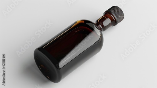 Elegant glass bottle filled with amber colored whiskey or bourbon spirit close up shot of premium liquor product with label and cap on white background