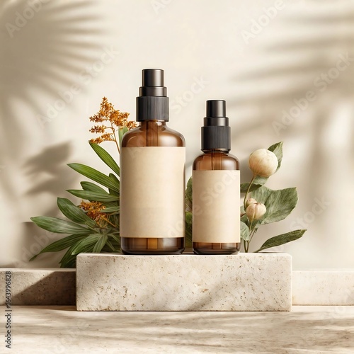 Elegant glass bottles with blank labels in a serene botanical setting highlight natural beauty and skincare