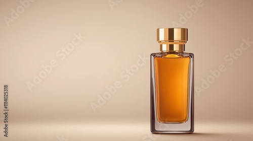 Elegant Glass Perfume Bottle Displaying a Rich Amber Liquid Against a Soft Neutral Background for Beauty and Fragrance Concepts