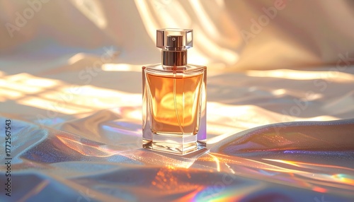 Elegant glass perfume bottle on shimmering, iridescent fabric, bathed in warm sunlight
