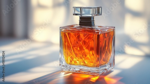 Elegant Glass Perfume Bottle with Amber Liquid in Sunlit Setting
