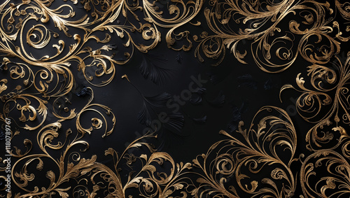 gold, black, floral, frame, background, design, pattern, texture, ornate, swirl, luxury, elegant, decorative, abstract, art, vintage, retro, classic, style, royals, rich, wallpaper, border, illustration, graphic, image, template, element, detail, scroll, motif, flourish, filigree, decoration, surface, arabesque, damask, acanthus, leaf, flower, curve, line, shape