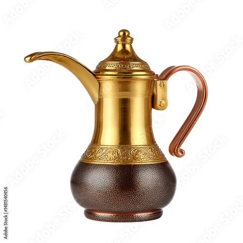 coffeepot, hot drink, pot, gold, elegant, traditional, vintage, beverage, kitchen utensile, home decor, tableware, serving, hospitality, luxury, gold, brown, ornate, decorative, design, craftsmanship, metal, handle, spout, lid, texture, detail, artisan, culture, heritage, classic, timeless, stylish, sophisticated, rich, warm, comfort, hot beverage, tea, drink, container, vessel, object, still life, isolated, studio shot