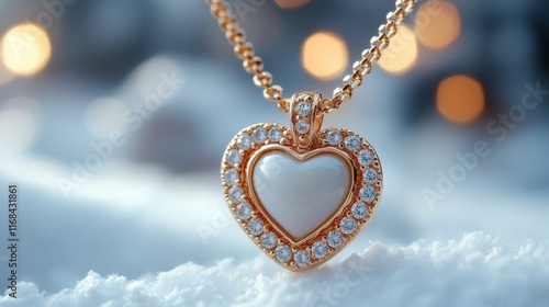 Elegant gold heart pendant necklace with diamonds rests on snow.