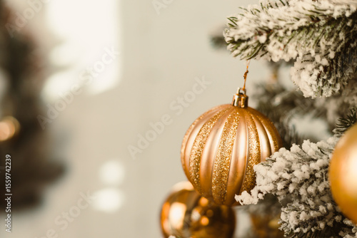 Elegant Golden Christmas Ornaments Adorning a Beautiful Winter Tree A Perfect Holiday Decoration to Enhance Your Festive Celebrations and Bring Cheer to Family Gatherings this Season