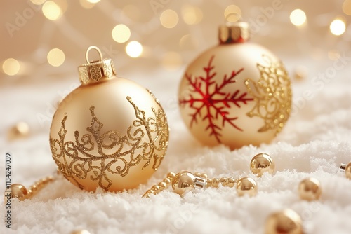 Elegant Golden Christmas Ornaments with Intricate Designs on Snowy Surface.