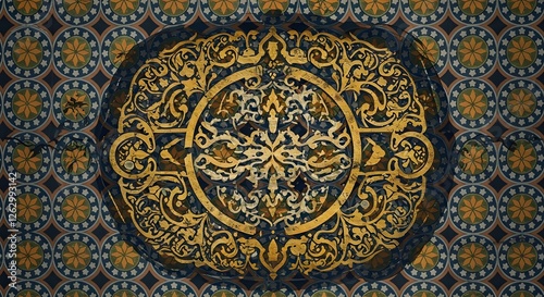 Elegant Golden Ornament with Floral Pattern on Decorative Vintage Tiles