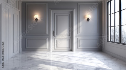 room, interior, design, elegant, grey, white, door, marble, floor, wall, paneling, modern, classic, luxury, home, house, apartment, building, architecture, style, decor, lighting, lamp, window, sunlight, shadow, space, empty, clean, bright, roomy, calm, serene, peaceful, minimalist, contemporary, sophisticated, residential, hallway, entranceway, antechamber