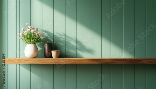 Elegant green wall paneling with wooden shelf and decorative vases in the kitchen