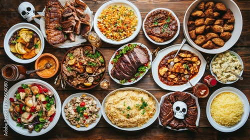 Elegant Halloween party in a modern American home a table set with gourmet spooky dishes