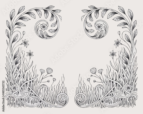 floral, botanical, flower, leaf, nature, ornament, decoration, design, illustration, drawing, hand-drawn, vignetting, line art, monochrome, black-and-white, elegant, artistic, flourish, border, frame, invitation, wedding, greeting card, vintage, retro, graphic, vector, art, template