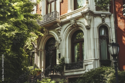 historical, building, architecture, greenery, urban, setting, sunlight, elegance, charme, facades, intricate, design, residential, city landscape, landscaping, heritage, culture, classic, style, decorative, element, entrance, robust, structure, window, detail, wrought, iron, plant, tree, peaceful, atmosphere, warm, nature, street, lamp, rich, colours, expression, unique, feature, architectural, cosy, surrounding, inviting, entranceway, cultural, landmark